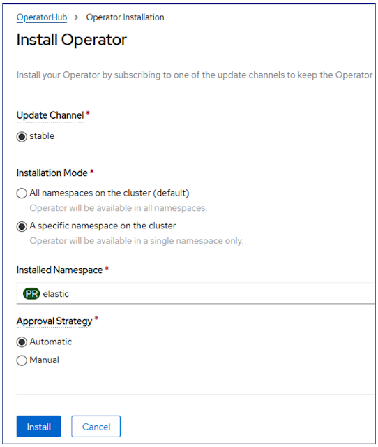 Install the ECK operator using openshift Operator Hub. Navigate to the OperatorHub search ECK