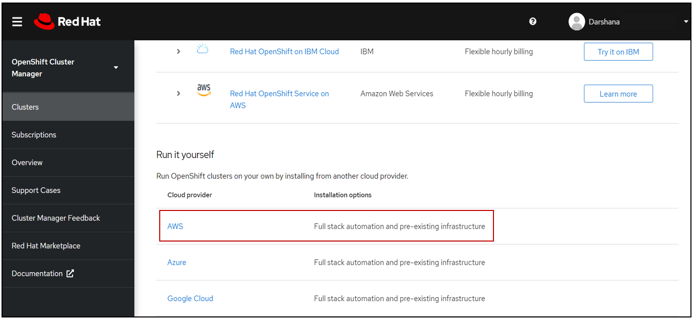 1. Create an account in Red Hat OpenShift (https://www.openshift.com/try) and select Cloud option. After you successfully create OpenShift account you will redirect to the following screen or select Cluster tab in left side and Create Cluster. Then select the AWS.